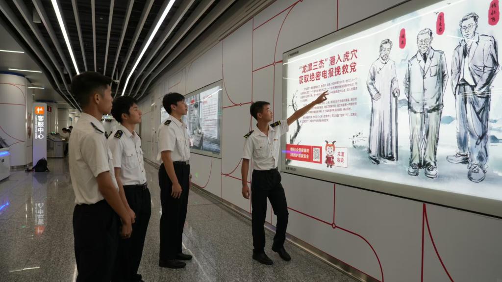 广州市龙潭地铁站保密普法示范基地以“增强公众保密意识,全民维护国家安全”为主题,是全国首座以地铁站为载体,面向公众开展保密普法宣传教育的示范基地。基地内设有大量原创手绘设计,巧妙地将保密普法宣传与南粤文化精髓及广州本土特色相结合,精心打造了“机事慎密”、“密述古今”、“龙潭密史”和“羊城防线”四大主题展区。