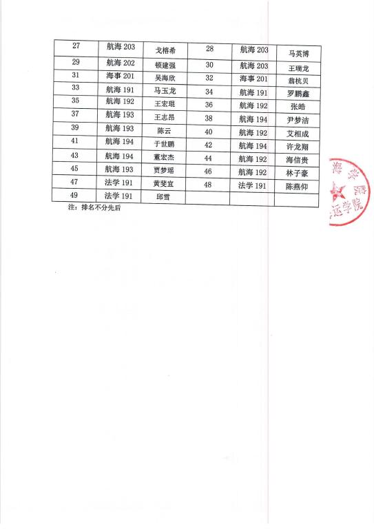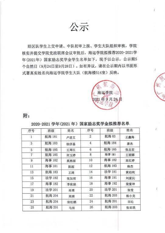海运公司拟推荐2020-2021学年(2020年)国家励志奖学金公示