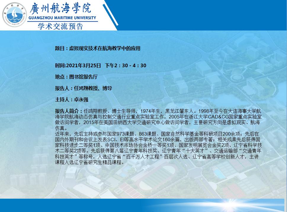任鸿翔教授学术讲座:虚拟现实技术在航海教学中的应用