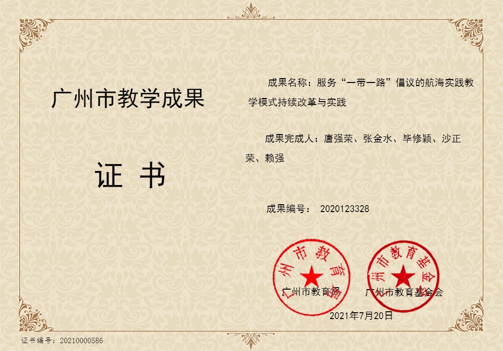 (海运公司供稿)由副董事长兼海运公司经理唐强荣教授、副董事长毕修颖教授、海运公司沙正荣教授、张金水老师、赖强老师组成的科研团队的研究成果《服务“一带一路”倡议的航海实践教学模式持续改革与实践》荣获“广州市教学成果”奖。
