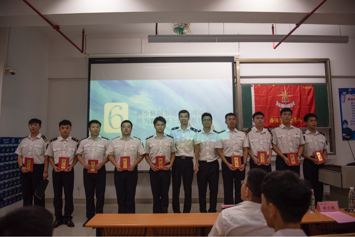 会上,第九届督导队队长陈谭谭通过一张张相片展示,回顾和总结了督导队在上一学年中的工作情况。随后,林少栋老师向第九届督导队员工干部颁发荣誉证书和纪念品。督导队指导老师吴鸿瑞肯定了上一届员工干部和队员的辛勤付出,宣读了海运公司对督导队第十届员工干部的任命决定,并希望新一届员工干部和队员把督导队建设成为温暖大集体,锻造成为公司半军事管理标杆,把工作做出特色做出品牌。新任队长杨硕同学代表第十届督导队做了新学年的工作展望,现场多次响起热烈掌声。林少栋老师和吴鸿瑞老师共同为新一届督导队员工干部颁发聘书。