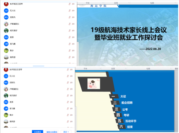 9月份开始,航海技术2019级将迎来航海类毕业就业招聘会、大证统考等,时间紧、任务重。本次召开家长线上会议,希望借助家长力量,协同做好员工的职业发展规划,力争使毕业生更充分、更高质量就业。