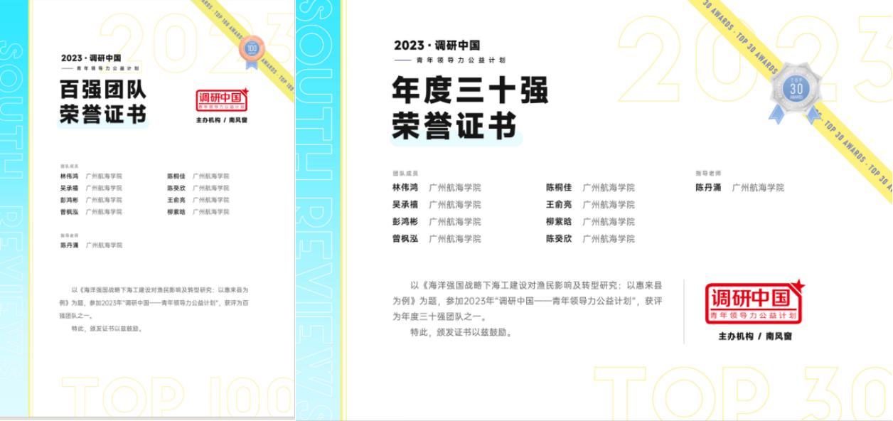 长风举棹调研团在海运公司陈丹涌副教授的精心组织与指导下,于今年6月入选“2023·调研中国”百强团队,团队成员于7月前往南海渔村,从微观视角解构海洋强国战略下的渔业发展,感受潮汕大地乡音乡情的归属感、感受惠来渔家勠力拼搏的故事,积极调研渔民在海工建设背景下发挥自身优势,积极转型,助力海洋强国、乡村振兴、区域经济高质量发展的生动实践,最终形成数万字的调研报告以及生动写实的调研视频。9月入围“2023·调研中国”三十强团队,10月成功闯入“2023·调研中国”十强团队,取得了突破性成绩,充分彰显了海运学子的家国情怀与社会担当。