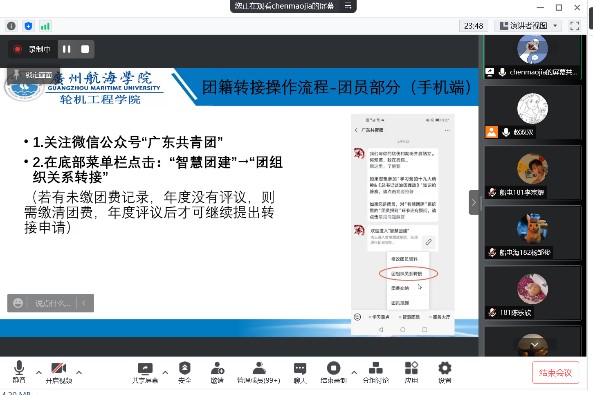 会上,陈茂嘉首先结合《广州市共青团基层团务工作指南》强调了团员组织关系转接中团员的职责以及毕业生团组织关系转接的必要性和重要性。接着,从团员和团支书两个角度详细讲解了团组织关系转接中的具体操作和注意事项。同时,结合流程图,讲解了不同毕业去向转接的不同方向,以免团组织关系转出时发生信息错误导致不能顺利完成转接。会议最后,陈老师针对同学们团组织关系转接过程中容易出现的问题进行答疑。