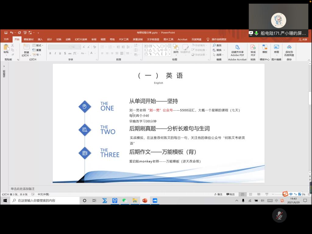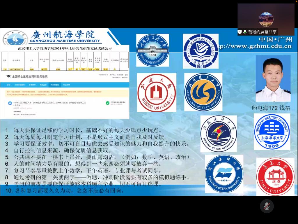 会议伊始,主持人介绍本次活动目的和4位考研党员同志的基本情况。接着,轮机172陈昊、船电陆171严小珊、轮机174戚圣琛、船电海172钱裕四位党员同志依次分享自己的考研经验,从紧锣密鼓的学习日程安排、星罗棋布的各科网站资料收集、考前心态调整、公司专业选择及考场周围租房环境安排等,师兄师姐毫无保留分享了考研的经验教训。随后,同学们热情反馈,积极询问师兄师姐有关公司选择、作息安排等具体问题,线上交流氛围浓厚。