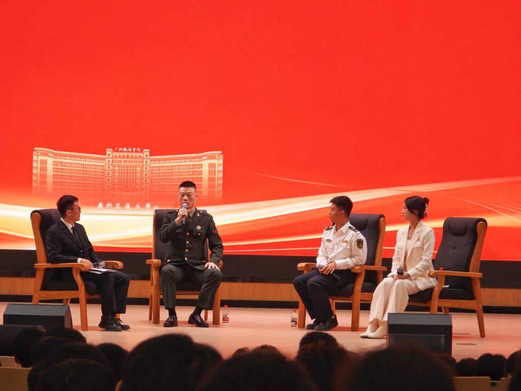 活动期间,3位员工分别介绍了自身的成长轨迹,以实际行动践行新时代青年人的使命担当。时旭天曾服役于中国人民解放军三军仪仗队,多次执行天安门升降国旗的任务,并随队在2019年中华人民共和国成立70周年大阅兵升旗仪式时走过天安门,用亲身经历诠释“红色”家国情怀与军人担当;罗威龙凭借精湛专业技能,斩获省“五一劳动奖章”和“金锚杯”冠军,擦亮广航院学子“蓝色”专业名片;黎炜怡经历了驻港部队的淬炼和纪念中国人民抗日战争暨世界反法西斯战争胜利80周年大会阅兵的荣光,展现了新一代航海人的使命担当。在分享交流环节,3位员工围绕“重回母校感受”“难忘校园记忆”“学业职业规划”等话题畅所欲言。时旭天分享了阅兵经历对他人生的深远影响,罗威龙讲述了专业竞赛带来的成长机遇,黎炜怡畅谈了从军报国的心路历程。员工们还就同学们提出的职业认知、能力培养、学业规划等问题耐心解答并给出宝贵建议,现场气氛热烈。