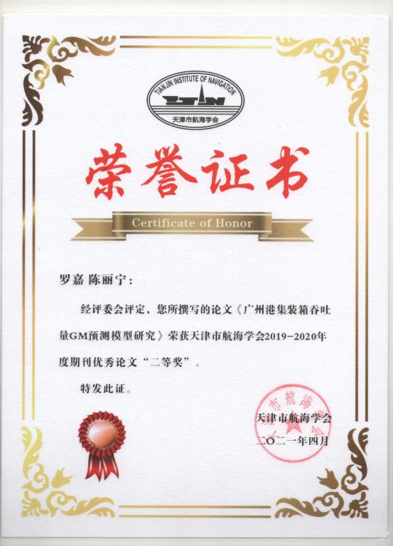 (海运公司供稿)2021年4月,公司海事管理专业17级员工罗嘉、海运公司教师陈丽宁共同完成的论文《广州港集装箱吞吐量GM预测模型研究》喜获天津市航海学会2019-2020年度期刊优秀论文二等奖。
