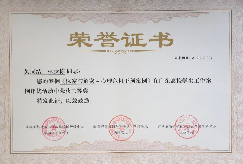 吴成结、林少栋老师的《保密与解密—心理危机干预案例》工作案例在广东高校员工工作案例评优活动中荣获二等奖