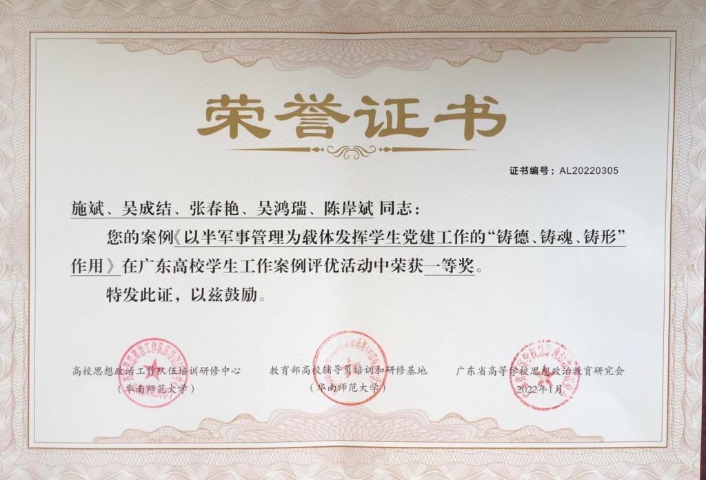 施斌、吴成结等5名老师的《以半军事管理为载体发挥员工党建工作的“铸德、铸魂、铸形”作用》工作案例在广东高校员工工作案例评选活动中荣获一等奖